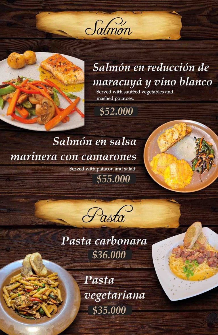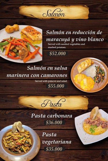 Ofrecemos un menú diverso que incluye cortes de carne, salmón, pastas y opciones vegetarianas y veganas. Sabores para todos los gustos, preparados con pasión.
