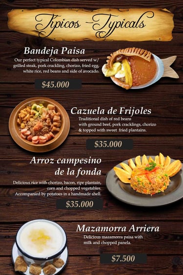 Cada plato es un tributo a la tradición y la riqueza de la cocina colombiana, servido con la calidez que nos caracteriza.