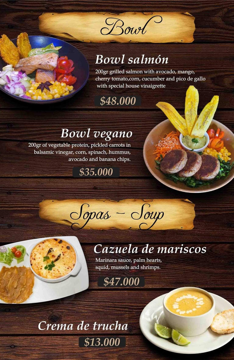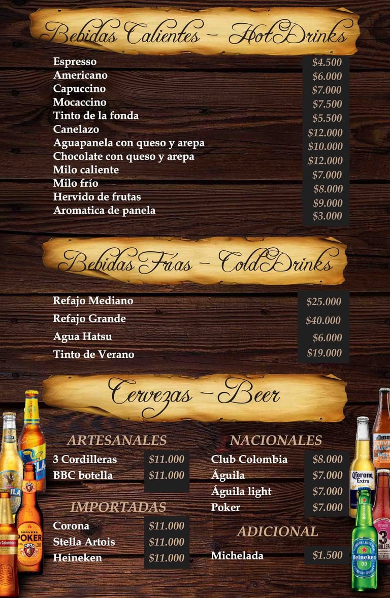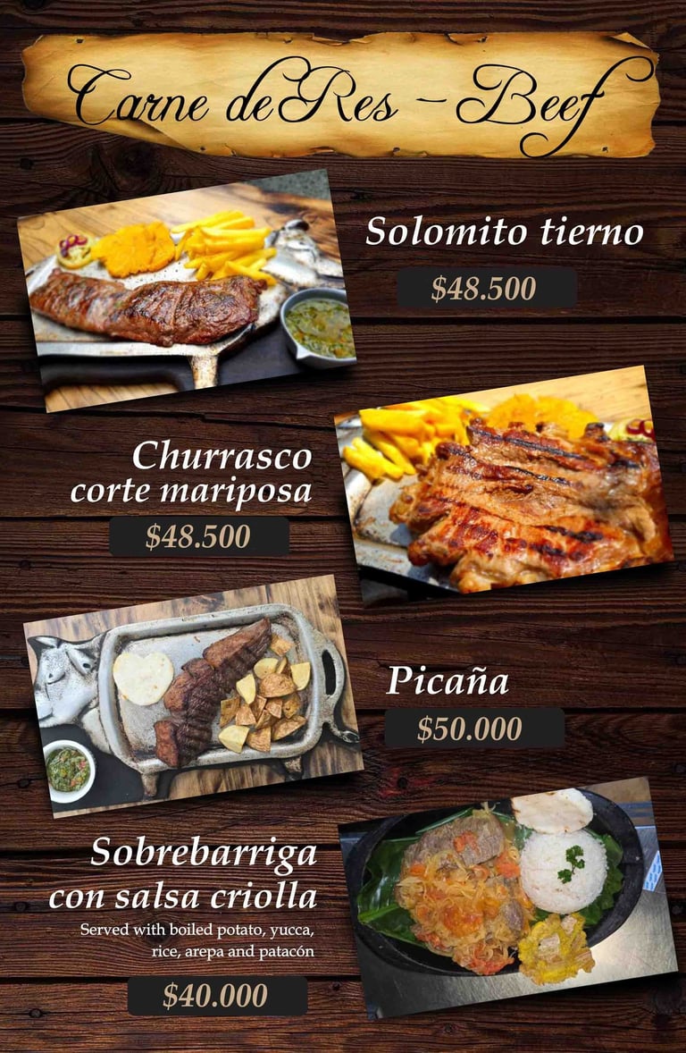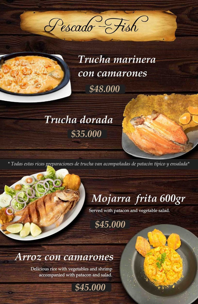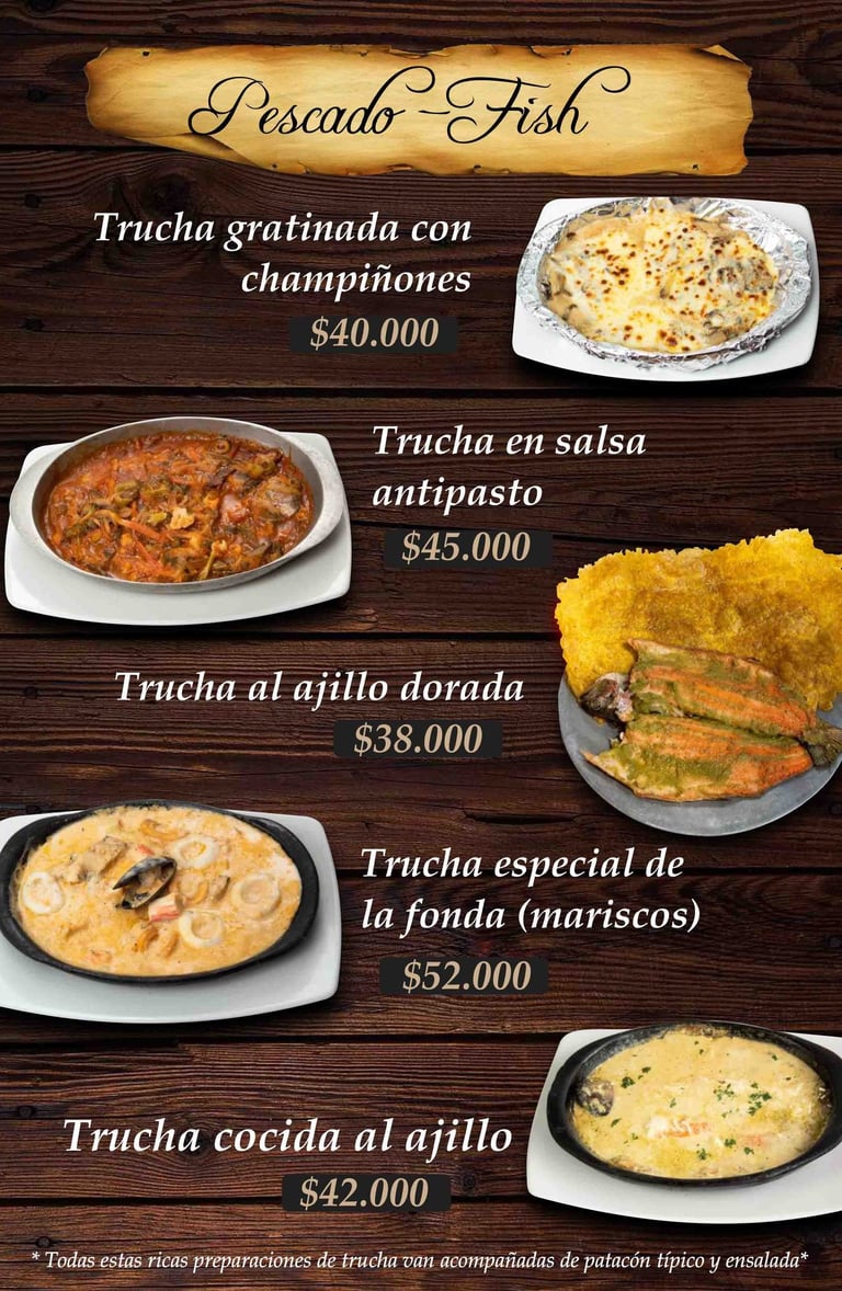 La estrella de nuestro menú es la icónica Bandeja Paisa, un plato robusto y lleno de sabor. También ofrecemos Trucha, la especialidad de la casa, preparada de diversas maneras, una reconfortante Cazuela de Frijoles, y una selección de Carnes y Pollo con recetas tradicionales, como nuestro jugoso Churrasco.